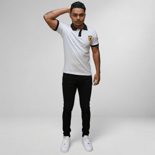 Marksmen Piqué Cotton Polo – White / Black Collar